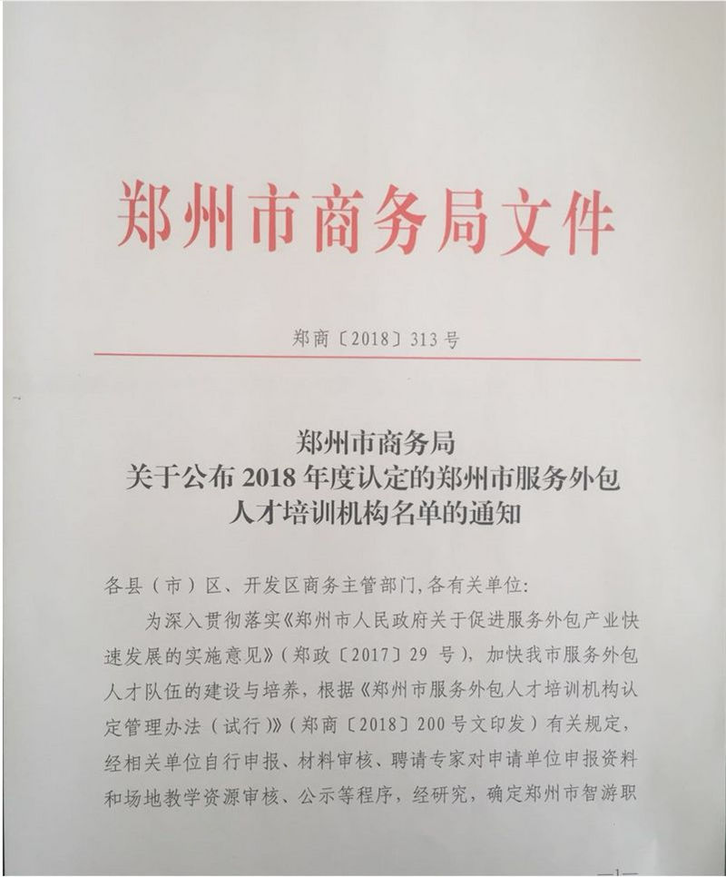 2018年,郑州市商务局通过相关单位自行申报、区级审核、聘请专家对申请单位申报资料和场地教学资源审核等程序严格筛选,选定6家机构作为郑州市“服务外包”人才培训机构。其中河南云和数据信息技术有限公司名称赫然在列。